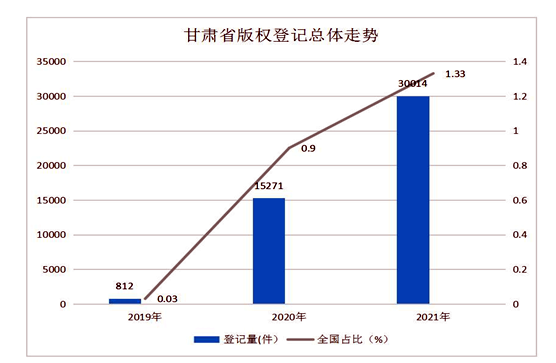 2018年6月,甘肃省委省政府决定建设丝绸之路国际知识产权港,围绕知识产权孵化培育、交易运营、维权服务、数字文创、金融服务、大数据六大建设任务,着力构建知识产权创造、集聚、运营、交易、保护和转化为一体的全生命周期、全产业链条服务体系。2020年1月,知识产权港开展版权登记工作,当年版权登记量年度增长率排名全国第一,2021年,作品登记数量翻番,年度增长率排名全国第二,两个年度均受到国家版权局通报表扬。知识产权港实现了甘肃在全国版权示范单位申报建设方面零的突破,被国家版权局授予“全国版权示范单位”荣誉称号。