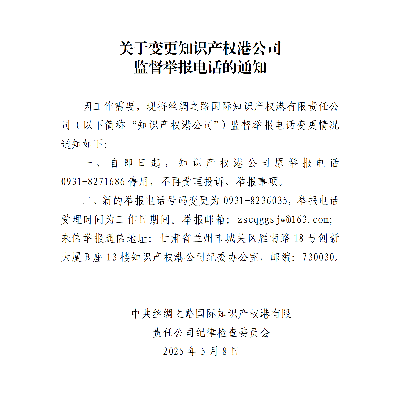 关于变更知识产权港公司监督举报电话的通知