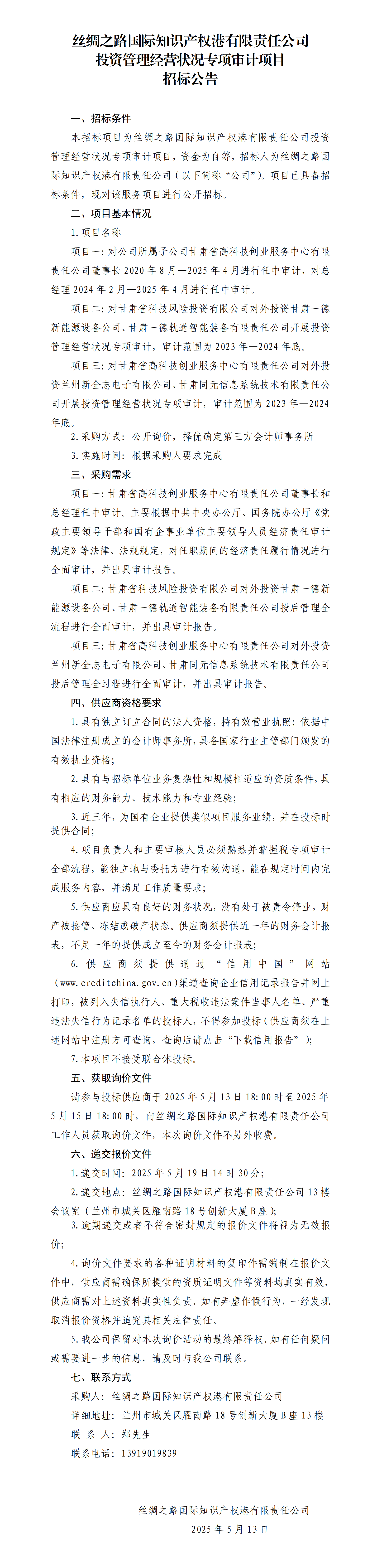 丝绸之路国际知识产权港有限责任公司投资管理经营状况专项审计项目招标公告