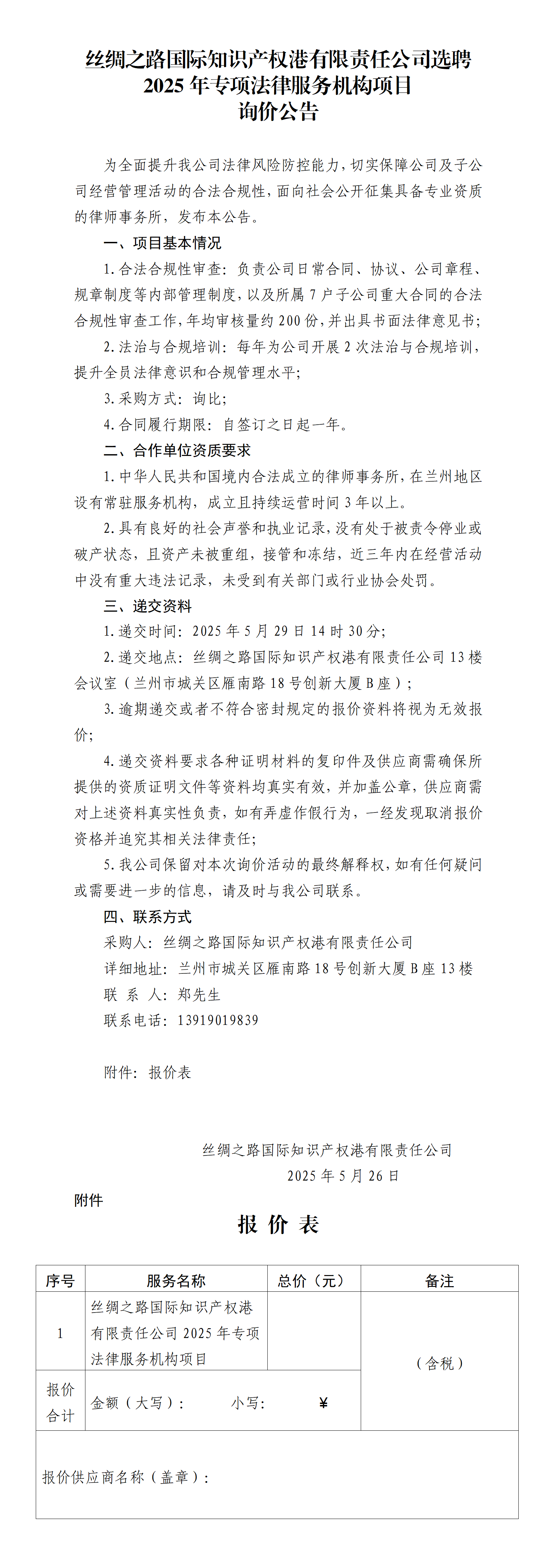 丝绸之路国际知识产权港有限责任公司选聘2025年专项法律服务机构项目询价公告